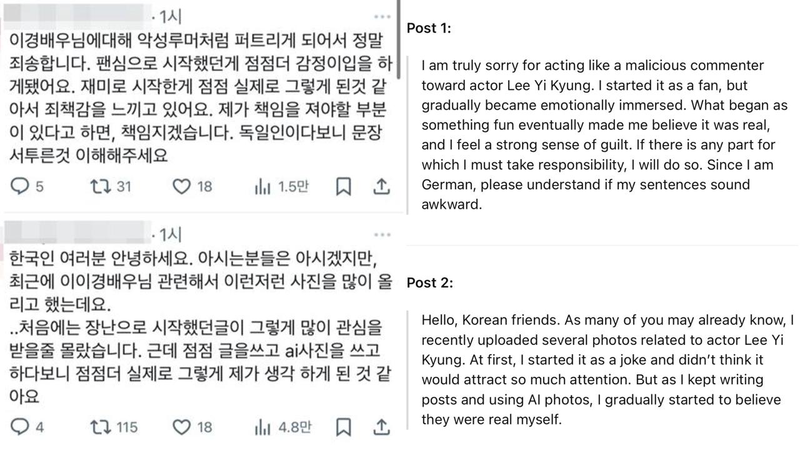 “I didn’t know that a post which started as a joke would receive so much attention. But as I kept writing and using AI photos, I started to believe in it myself. I sincerely apologize for spreading malicious rumors about actor Lee Yi Kyung.”