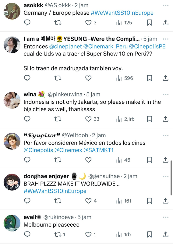 The enthusiasm of international fans is already flooding social media. In response to the official announcement, many fans commented on X asking for the screenings to go beyond major cities or specific regions. Fans in Europe, Mexico, and Peru are urging local cinema chains to bring the concert to their countries. Meanwhile, Indonesian fans are hoping the screening will reach more cities beyond Jakarta. From Melbourne to Germany, fans are voicing their wishes with hashtags like #WeWantSS10inEurope, proving that Super Junior’s global influence remains as strong as ever. The demand for a synchronized worldwide cinema screening reflects the unwavering loyalty of their fandom—20 years have passed, but the spirit of E.L.F is still burning brightly.
