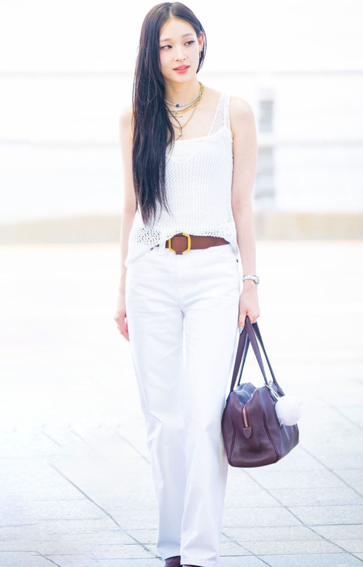 Karina turned heads with a flowing white maxi dress layered over dark jeans and paired with flat sandals. A bold black belt cinched her waist, while a soft pink shirt in hand added a sweet pop of color. This look captured Karina’s feminine charm while showing off her edgy side.