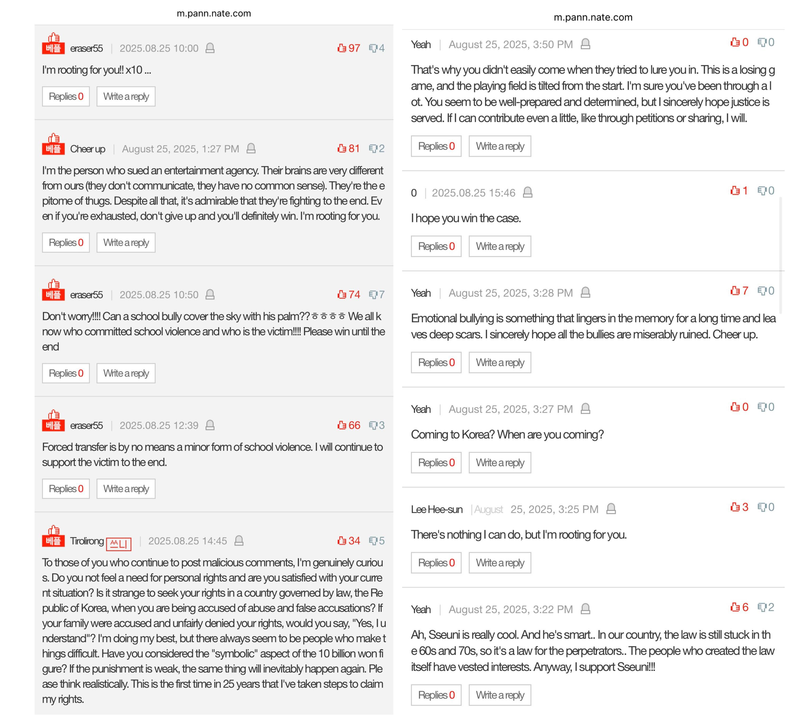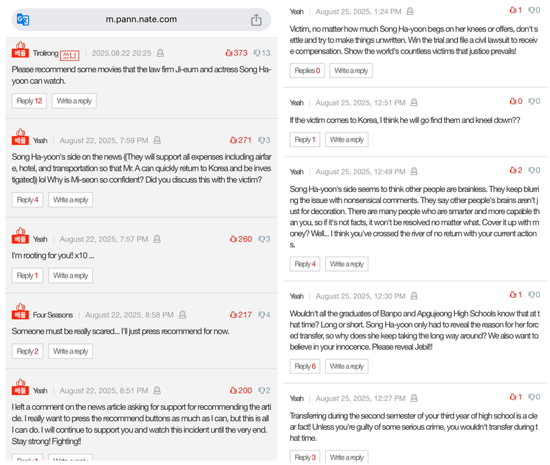 The case has once again triggered a wave of comments on Pannate, with many netizens openly voicing support for Mr. A, calling him brave for standing up to the system, and urging Song Ha-yoon to disclose the school documents that could clarify the controversy.
