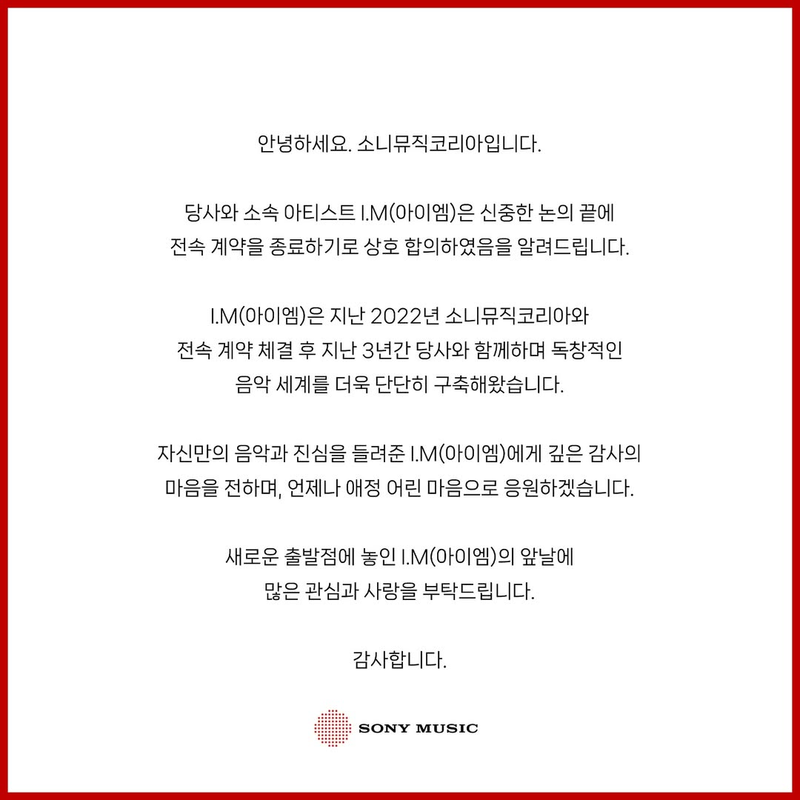"Since signing with us in 2022, I.M has spent the past three years building a stronger and more distinctive musical identity together with our company. We sincerely thank I.M for sharing his music and sincerity with us, and we will continue to support him with affection and respect," Sony Music Korea expressed their gratitude, quoted from Soompi.